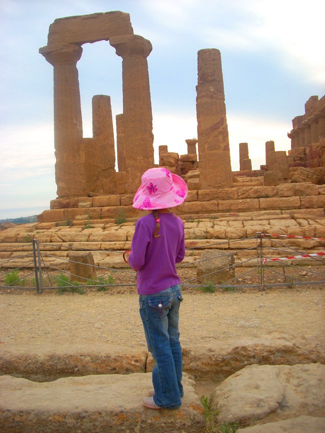 Axa was most impressed by the colossal temple of Zeus, which was never finished, and has now mostly fallen down, but retains a majestic, ruined grandeur. It once bore a large and detailed wall relief of the battle of Troy (always a winner for Axa), and was held up by a massive statue of Atlas. From outside, the temple now resembles a mountain of massive stones. But a pathway winds in through to its heart, where crumbling steps and rooms suggest half-guessed purposes, and poppies gently toss their heads in an eternal stillness of memory and antiquity.