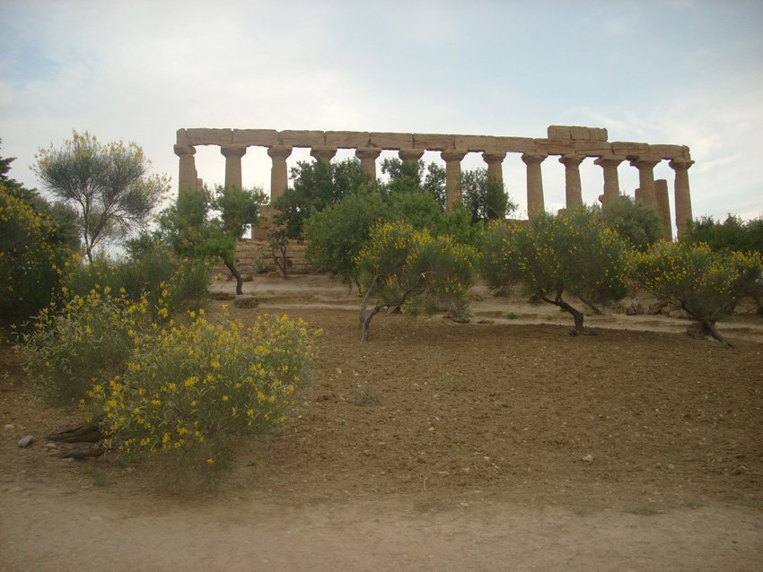 I'm not sure whence it derived its name, but strictly (or even loosely) speaking, the Valley of Temples is not really a valley, but more like a ridge. The Greeks, like many other people, including Mormons, typically built their holy places on hills. Hills are, well, holier. Closer to heaven. More awe-inspiring. And easier to defend too, when it comes to that. As apparently it did for Agrigento on multiple occasions. The Temple of Hera, for example (below), still bears fiery traces of the Carthaginian invasion of 406 B.C. Later invasions by the Romans and Saracens also took their toll on the temples. While what still stands is overwhelming, one can only imagine its original glory based on the quantity of huge fallen stones strewn all over the several square kilometers of the "valley." It looks as if giants had been building there.