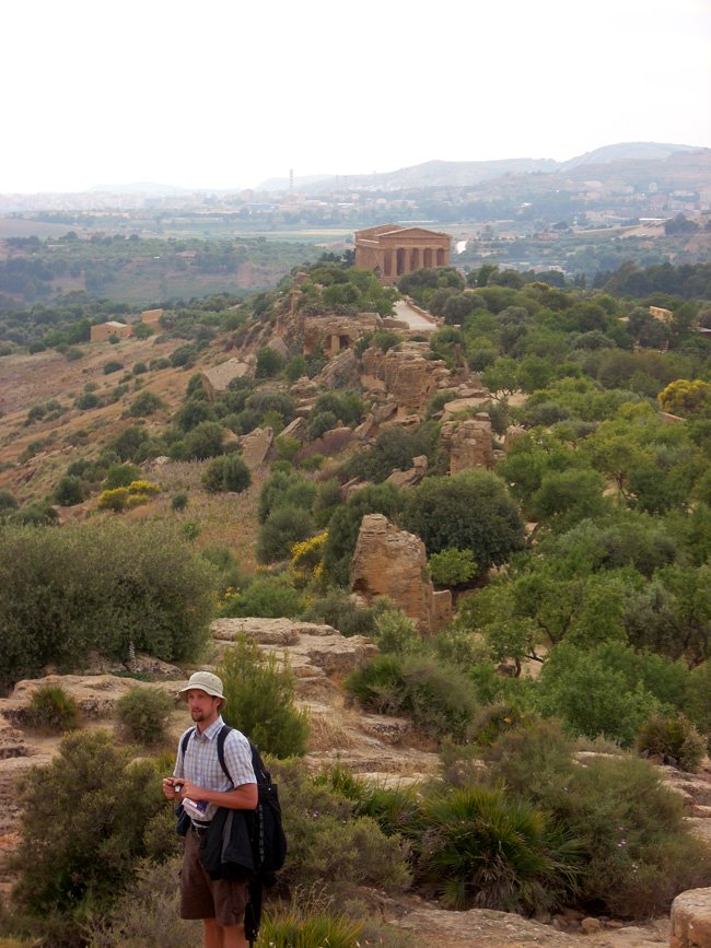 We have now also visited ancient Greece, although we have never left the Italian island of Sicily. I can happily report that "one of the most important archaeological sites in Europe" lives up to its reputation. Magnificently. Even glimpsed from a distance, as we have seen it every day on our walks through the eucalyptus grove near Stathis and Elettra's house, the "Valley of Temples" looked like something so lovely and classical as to seem almost unreal. And actually standing in the shadow of those temples was even more awesome than I had imagined it would be. Ancient Roman ruins impress me, but ancient Greek ruins move me.