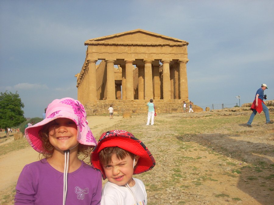 Agrigento has a lovely cobblestone interior, which we visited with Stathis and Elettra. Tony was very pleased when they offered to introduce us to the Italian practice of aperitivo, since he's only been Italian for two years, and is still working on being authentic. We sat down at an outside cafe with tables in the middle of a cobblestone street. One of the chairs at our table was a wicker pendulum swing. The children took turns in it first, but when our drinks came, I installed them in solider seats and took possession of the swing. Our friends had wine, the children had juice, and we had a non-alcoholic aperitivo that tasted like a mixture of coca cola and grapefruit. Interesting, and not bad, especially with the food, which comes included in the price of a drink. An aperitivo is sort of like a mini-buffet. Ours had salami, artistically filled deviled eggs, strong olives, sun-dried tomatoes (a Sicilian specialty), boconcini (little balls of fresh mozarella), chocolate and parmesan sandwiches (weird, but good), etc. Being a teetotaler, I've never done Happy Hour in the United States, and can't really comment authoritatively on the differences. In Italy, aperitivo doesn't include reduced prices on drinks. In fact, the drinks cost more than normal (although they include the buffet), and people only drink one. The emphasis (as usual, in Italy) is on talking, socializing, and enjoying really good food.