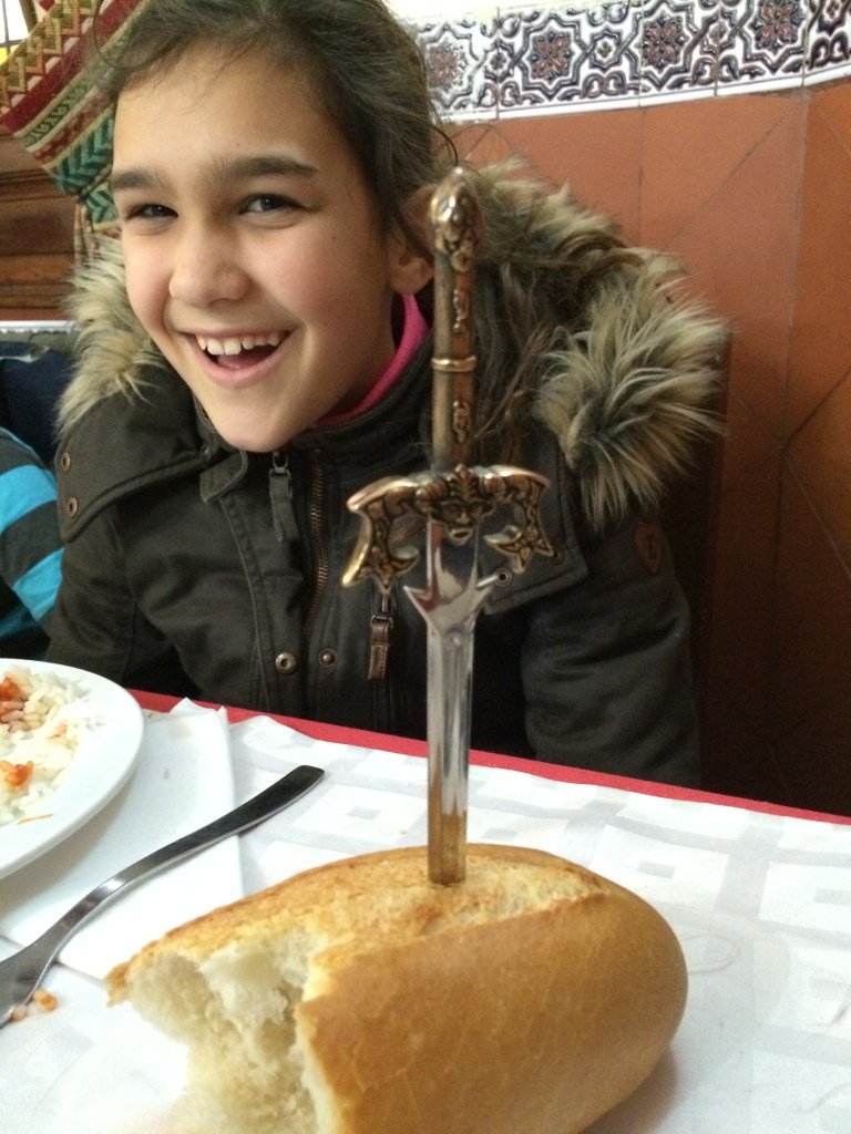 After seeing the cathedral, we had lunch, where this time upon ordering a glass of wine they brought me an entire pitcher full. After lunch, we decided it was time to it the tourist shops. Toledo may be the most delightful place in Spain to buy souvenirs. Toledo steel is famous for making the best swords, and so the town is full of them, as well as suits of armor, daggers, and-unaccountably-scissors. Axa and Raj were entranced by the swords, and we couldn't resist buying them miniature versions (after solemn promises not to poke their own or each other's eyes out with them).