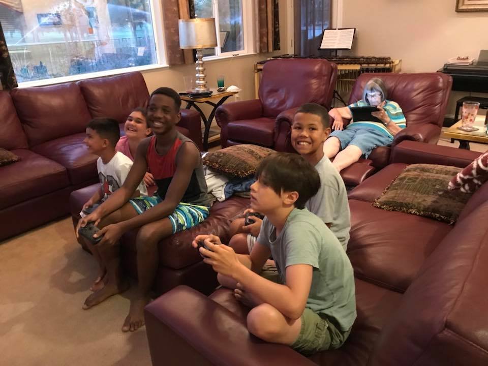 playing video games with Zech, Michael, and Ryan at Grammy and Pampas house (Great Grandma Familia in the backgroud) |